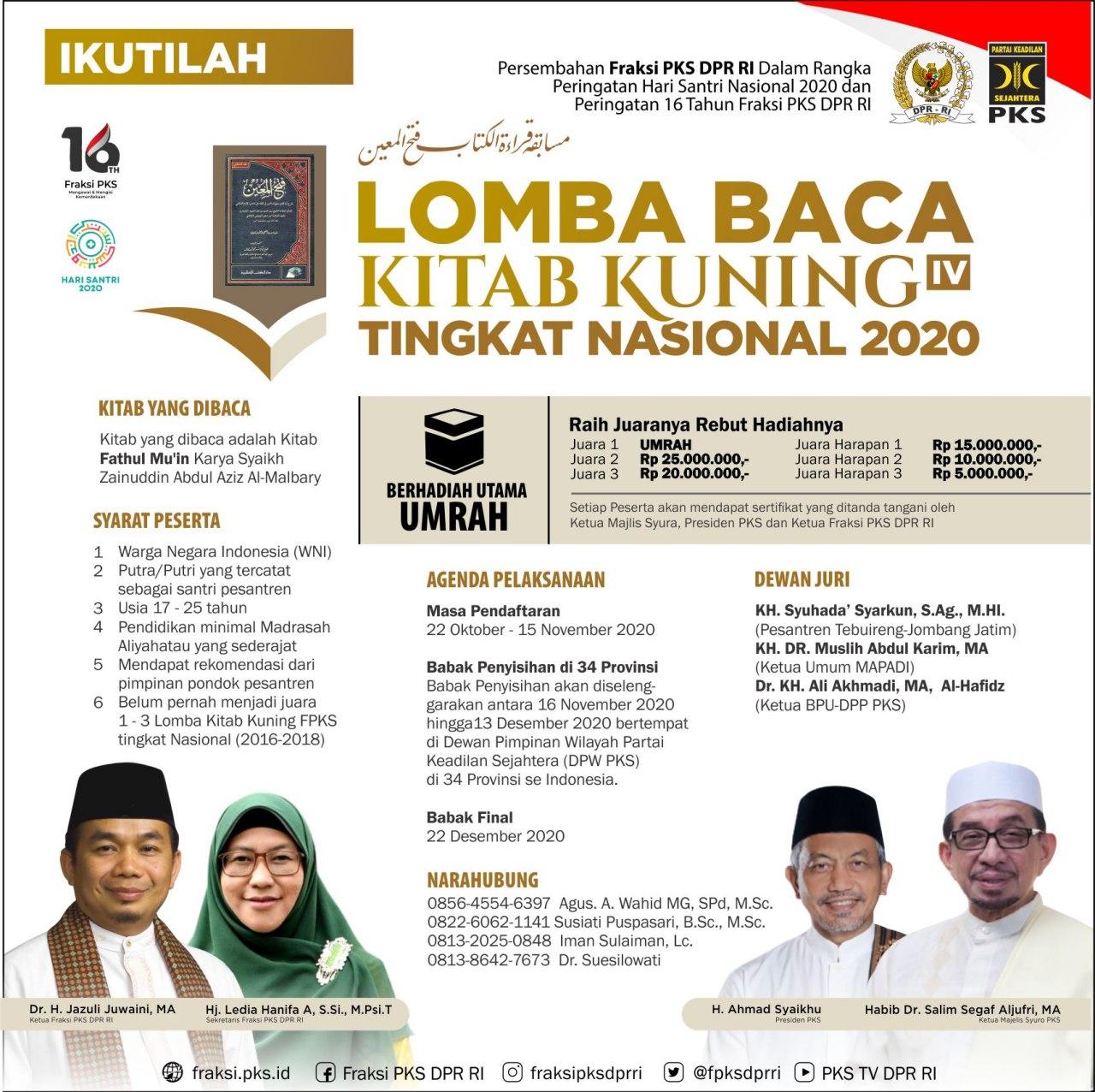 Lomba Baca Kitab Kuning IV Tingkat Nasional 2020 23/10/2020 09:40 Humas Fraksi PKS Facebook Twitter WhatsApp Telegram