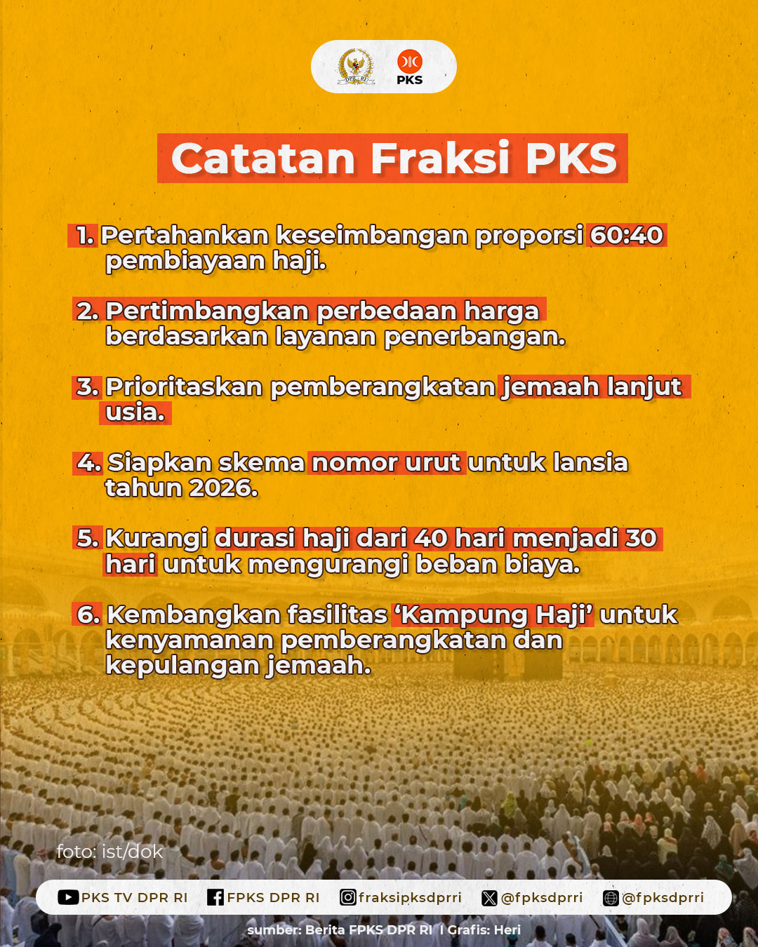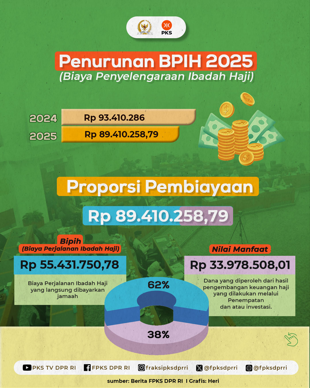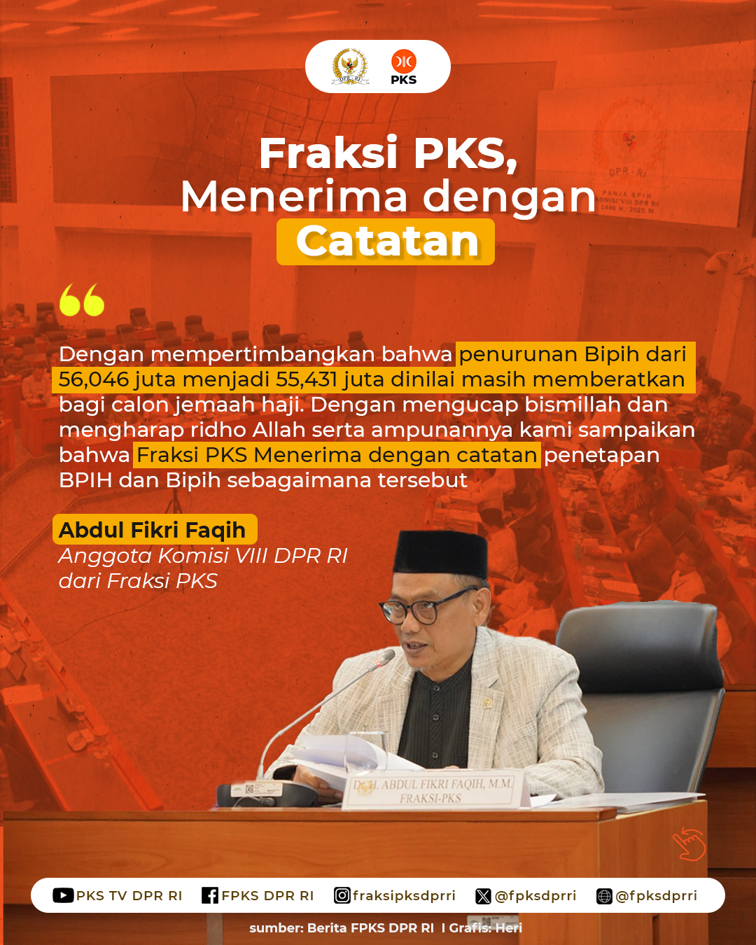 Bersama Panja BPIH, PKS Berhasil Turunkan Biaya Haji 2025 23/01/2025 14:37 Muhammad Rofik Nawawi Facebook Twitter WhatsApp Telegram Bersama Pemerintah, Fraksi PKS Berhasil Turunkan Biaya Haji 2025‼️ Simak catatan-catatan penting dalam Fraksi PKS DPR RI terkait Biaya Penyelenggaraan Ibadah Haji Tahun 2025 dalam infografis di atas.