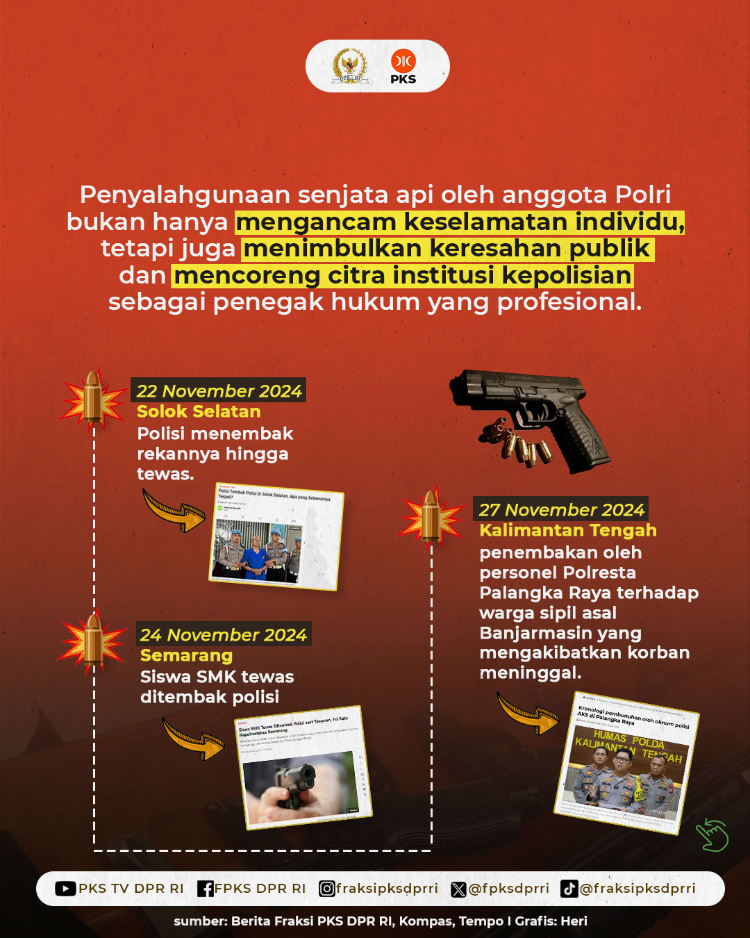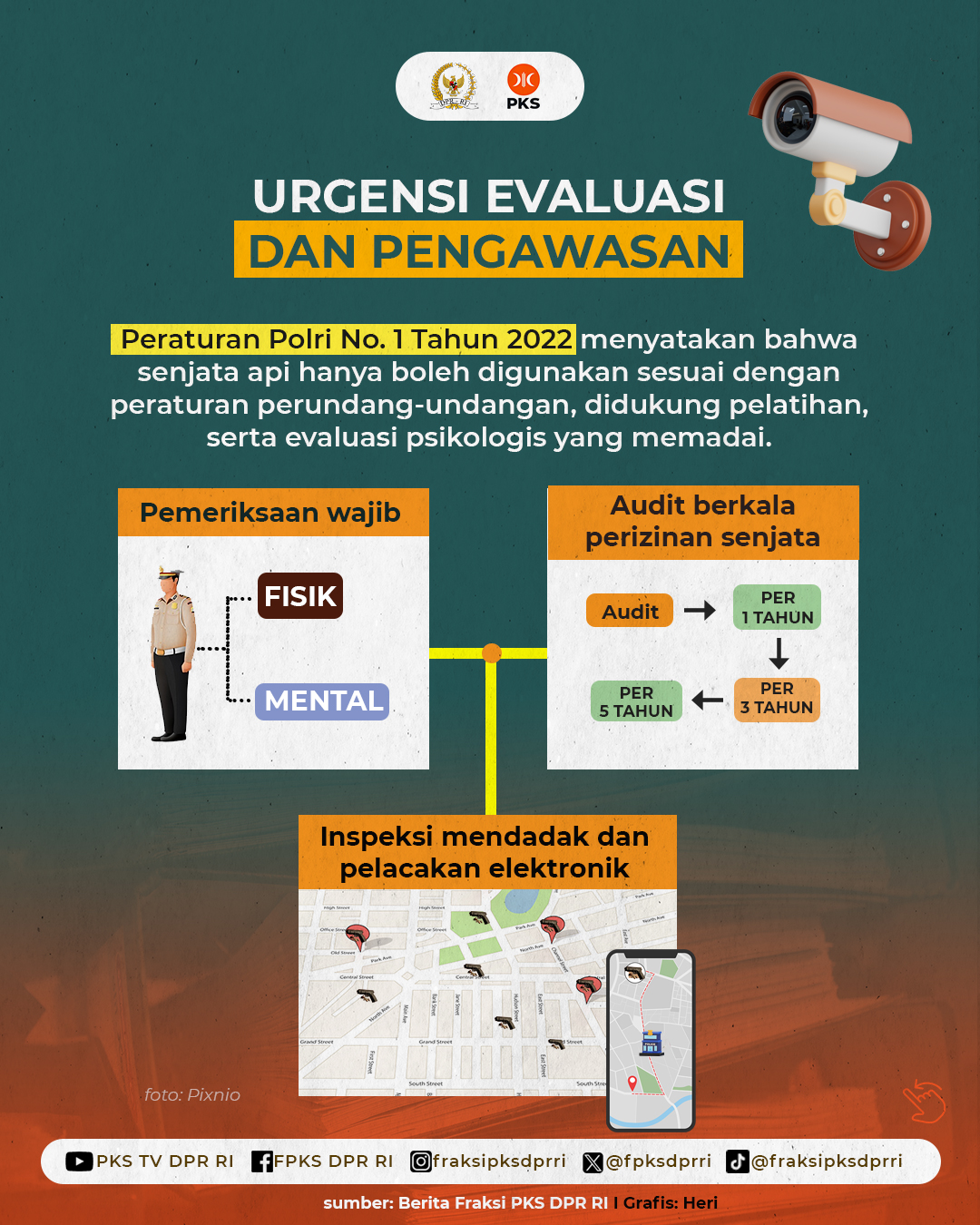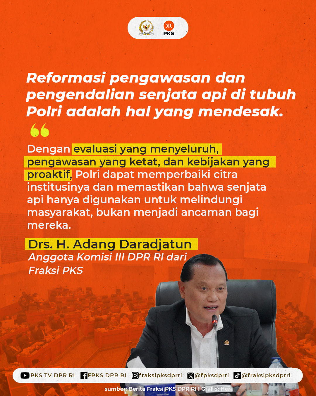 Menanggapi sejumlah insiden penembakan yang melibatkan anggota polisi, Anggota Komisi III DPR RI dari F-PKS, Adang Daradjatun, menekankan pentingnya evaluasi dan pengawasan atas penggunaan senjata api oleh anggota Polri. Simak selengkapnya melalui infografis berikut.