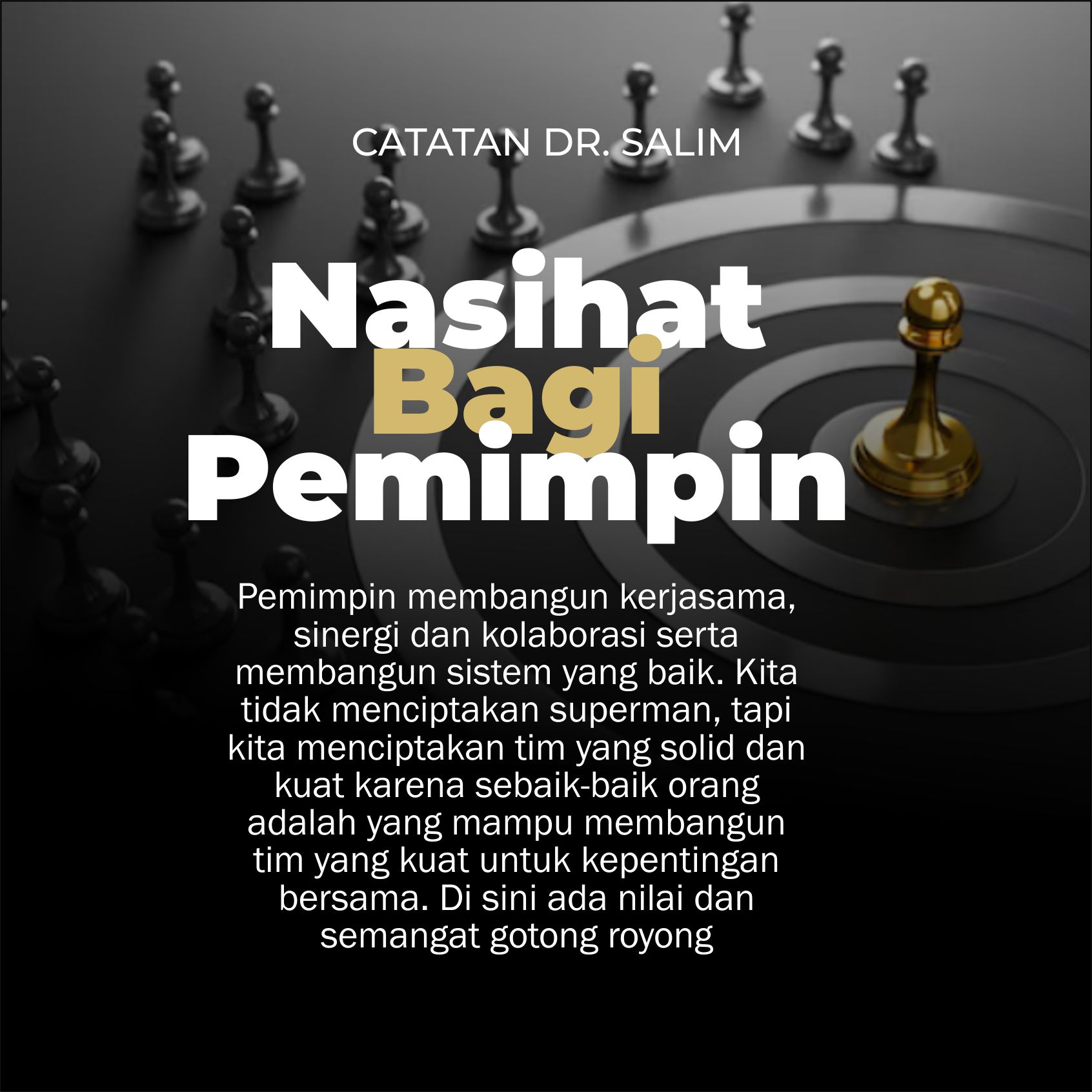 Pemimpin membangun kerjasama, sinergi dan kolaborasi serta membangun sistem yang baik. Kita tidak menciptakan superman, tapi kita menciptakan tim yang solid dan kuat karena sebaik-baik orang adalah yang mampu membangun tim yang kuat untuk kepentingan bersama. Di sini ada nilai dan semangat gotong royong.