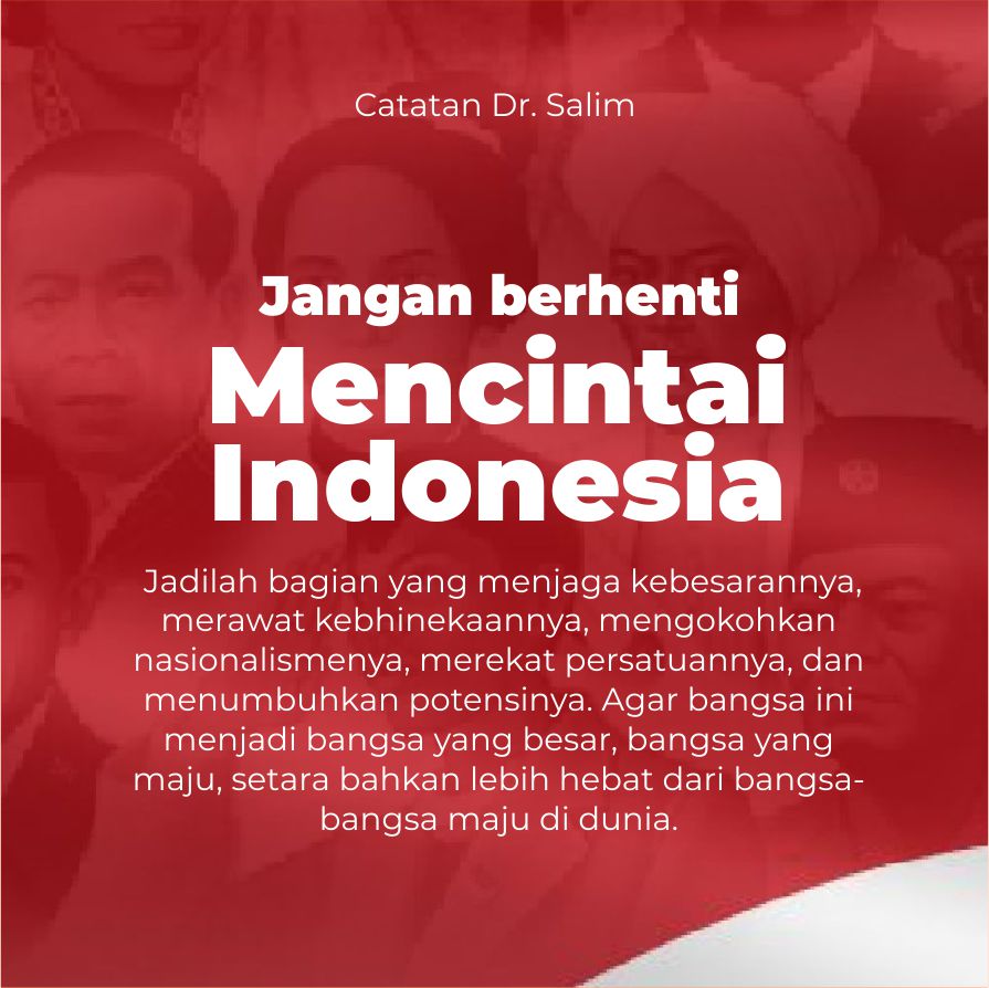Sebagai bagian dari ketaladanan para pahlawan, kita semua harus punya pemahaman yang benar terhadap bangsa ini. Di antara yang paling penting adalah pemahaman bahwa bangsa ini milik kita bersama. Oleh karena itu jangan berhenti mencintai Indonesia. Jadilah bagian yang menjaga kebesarannya, merawat kebhinekaannya, mengokohkan nasionalismenya, merekat per-satuannya, dan menumbuhkan potensinya. Agar bangsa ini menjadi bangsa yang besar, bangsa yang maju, setara bahkan lebih hebat dari bangsa-bangsa maju di dunia.