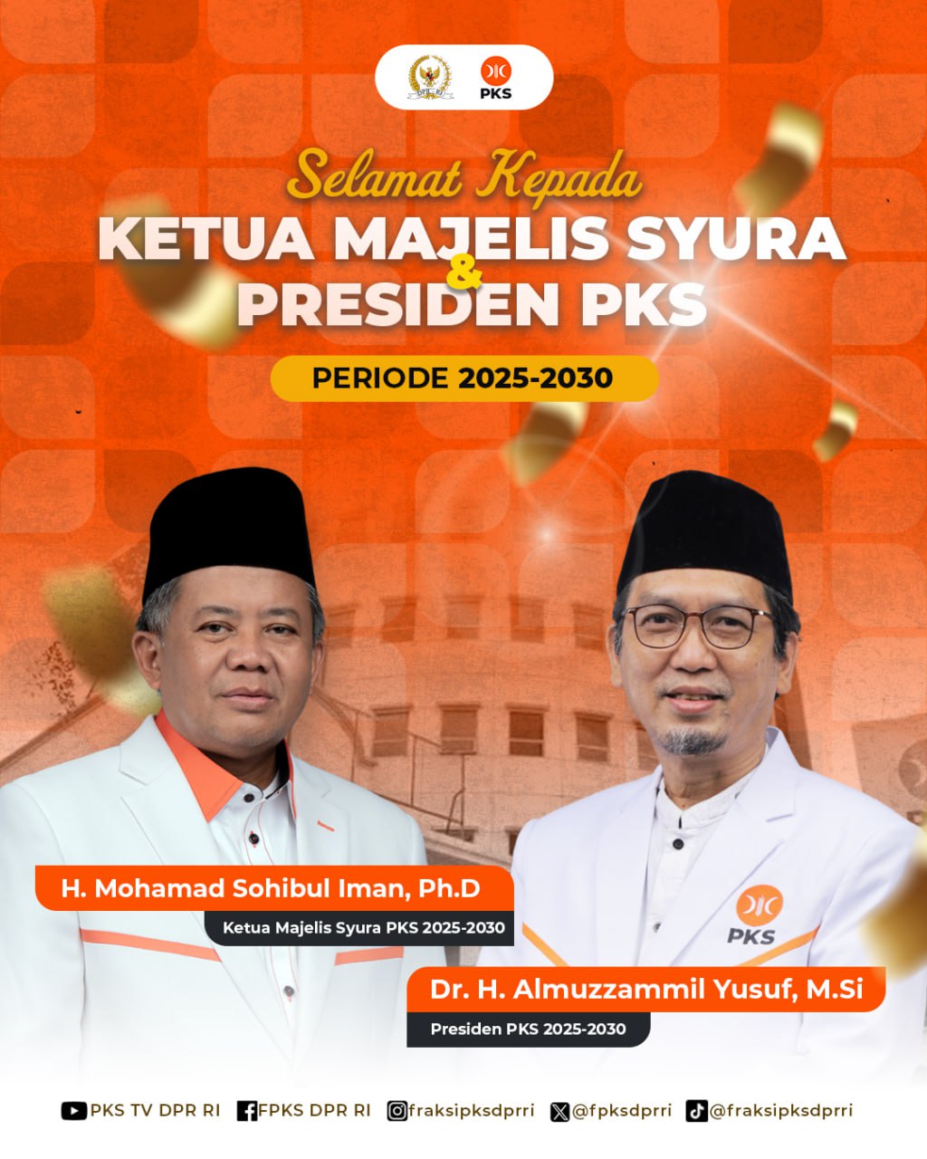 Jakarta (04/06) — Hasil Musyawarah I Majelis Syura Partai Keadilan Sejahtera (PKS) periode 2025–2030 yang dilaksanakan pada Selasa-Rabu, 3-4 Juni 2025 menetapkan secara musyawarah mufakat H. Mohamad Sohibul Iman, Ph.D. sebagai Ketua Majelis Syura PKS dan Dr. H. Almuzzammil Yusuf sebagai Presiden PKS terpilih untuk periode 2025–2030.